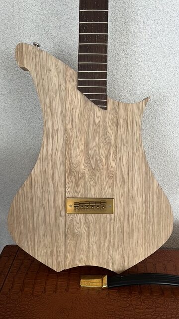 Leon, die ik al bijna 35 jaar ken, heeft mij drie jaar geleden echt verrast met deze, door hem zelf gebouwde, Thunderbird. De neck shape is gebaseerd op die van mijn Rickenbacker 4001. De verbindigen met de body-delen op de doorlopende hals zijn authentiek en de resonantie is subliem. De klank is goed en qua bespeelbaarheid, feel en power doet hij zeker niet onder aan de RIC.